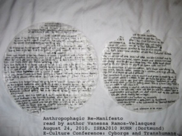 Vanessa Ramos-Velasquez criou uma teoria e poema-manifesto com uma nova visão projetada na Revolução Digital, tendo como ponto de partida o Manifesto Antropófago, escrito pelo autor modernista brasileiro Oswald de Andrade em 1928. O original foi uma afirmação da voz única brasileira na época moderna emergente, longe dos clichês do colonialismo, embora assumindo abertamente a metabolização de referências vindas do Primeiro Mundo. A releitura criada por Ramos-Velasquez por sua vez, em Antropofagia Digital, contendo o Re-Manifesto Antropofágico para a Era Digital visa atualizar a prática antropofágica do canibalismo cultural para a Era Digital num mundo de co-existência virtual que está se transformando na nova fronteira a ser colonizada e onde qualquer um pode vir a ser o colonizador. Ramos-Velasquez propõe que "Antropofagia Digital" seja: